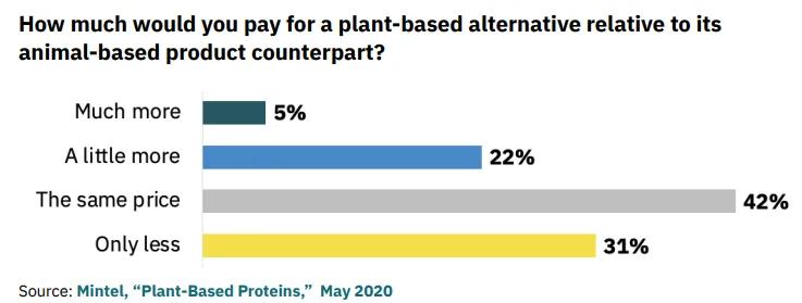 - Price. Currently, alternative proteins typically have a price premium compared to animal proteins. If alternative proteins are to reach larger consumer groups, the cost must match or undercut that of non-organic animal proteins.