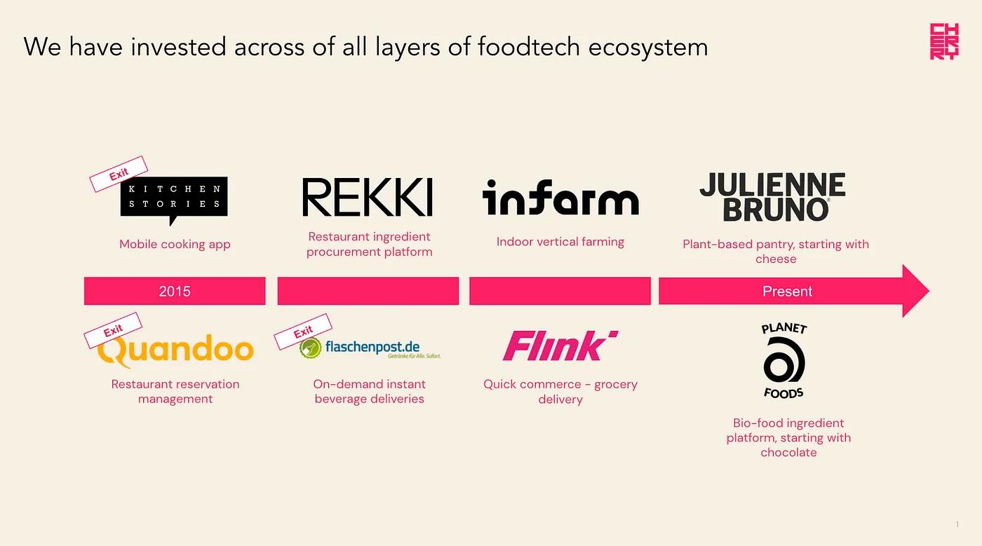 From revolutionary vertical farms (Infarm) to the industry defining software that lets restaurants communicate with their suppliers (Rekki) to lab-produced cocoa (Planet A Foods formerly known as QOA), and of course, to the fastest way to get your groceries (Flink) and beverages (flaschenpost), we have invested across most food tech verticals. Just this week, we announced the addition of JULIENNE BRUNO, which is creating a plant-based pantry starting with cheese, into our portfolio after leading its £6 million seed round.