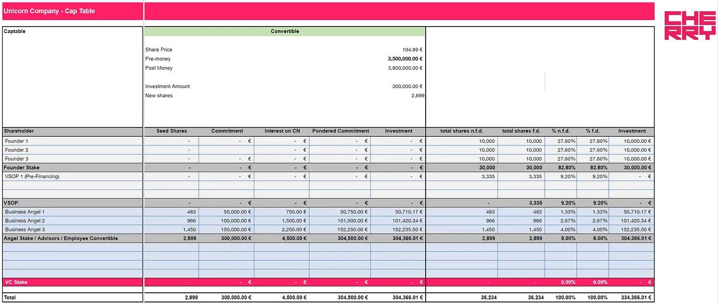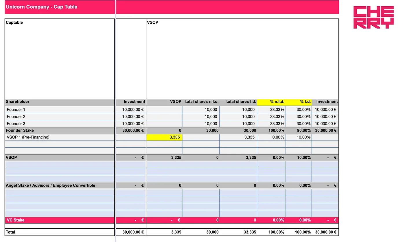 With the creation of the VSOP pool, we now have two views on the company: a non-fully diluted view (“n.f.d”) and a fully diluted view (“f.d.”). The n.f.d. view reflects the official view you can also find in a commercial register. It only considers real equity shares of the company, hence actual legal shareholding. The f.d. view, however, is relevant to you and your shareholders regarding the economic outcome in case of an exit and for determining share prices in future rounds (Pro tip: Always use the fully diluted share count/price).