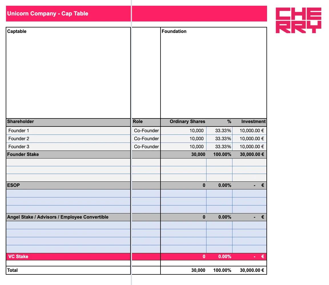 After brainstorming and researching for months, you as a founder finally decide to start Unicorn Company. Luckily, you are not alone and have two complementary cofounders. You sign the incorporation documents and off you go.