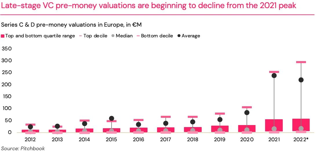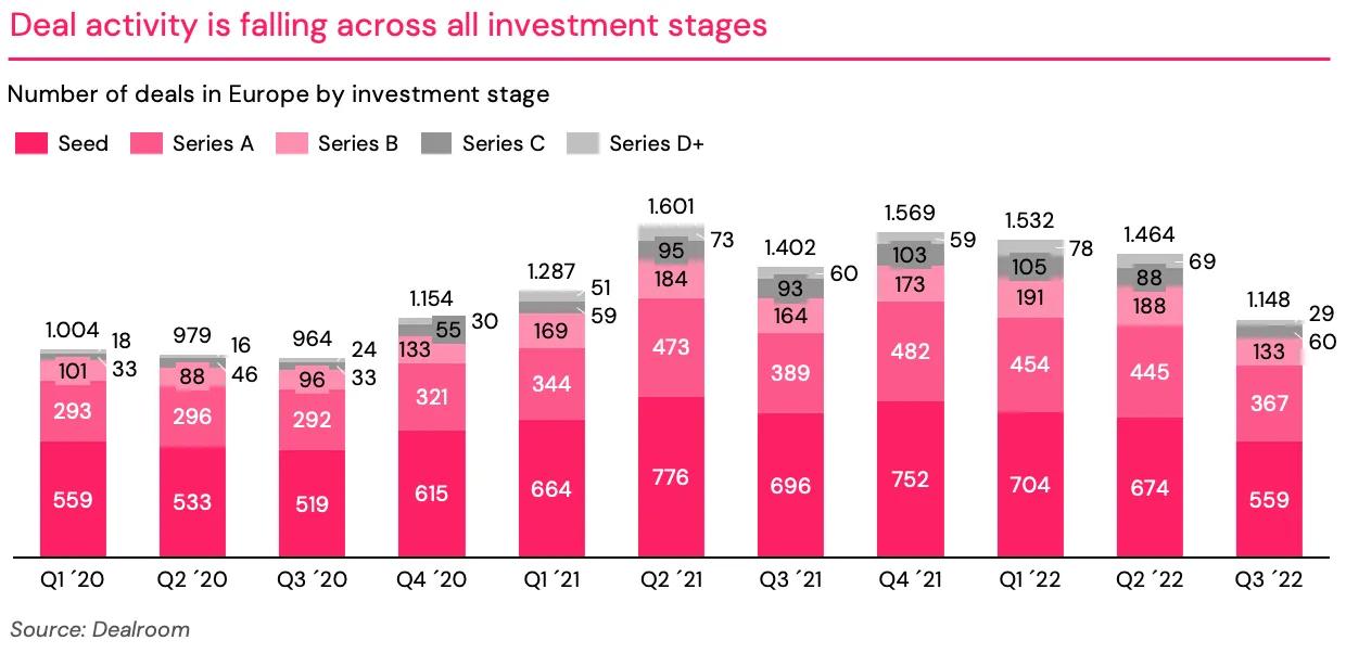 Although financing rounds are still being led by reputable investors, we are seeing that it takes longer for these rounds to close and there have been examples of high-quality teams with strong performance finding it more challenging than usual to secure a lead investor for their follow-on round. In Q3, 60 Series C and 29 Series D+ deals were closed in Europe, down 35% and 52% YoY respectively, and the downward trend has accelerated further in Q4, with the number of Series C and D+ deals closed tracking at 49% and 67% below the respective equivalent periods last year.