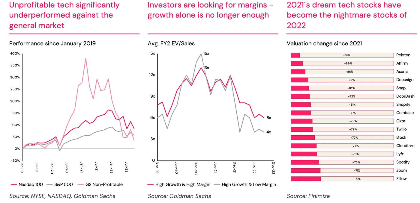 Public valuations continued to compress significantly on the back of higher rates and ongoing macroeconomic and geopolitical uncertainty. Predictably, growth and tech stocks have suffered the most in this environment as investors rotate out of positions that rely heavily on back-loaded value coming from profitability that could still be years away (GS Non-Profitable Tech Basket down -75% from Feb-21 high and down -60% YTD vs S&P approximately flat since Feb-21 and down -20% YTD). At the same time, higher rates have also made cash burn much more expensive to finance, adding yet more pressure on companies to prioritize profitability over growth.