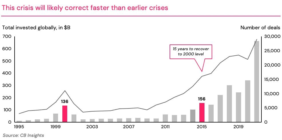 In spite of these challenges, there is a silver lining. In the long term, we expect the venture market to recover from this crisis much faster than it did after previous economic dips, such as the dot-com bubble in the early 2000s. The ecosystem has since matured and is now able to recycle capital and talent faster than before, supported by $2.5 trillion of dry powder globally, 8.5x the amount in 2000. The supply of innovative new companies is much greater and the rate of new company formation is less tied to public markets. Additionally, the venture market benefits from technology adoption rates that are much higher than what we saw a couple of decades ago (for example, ChatGPT crossed 1 million users in 5 days). Nevertheless, returning to the short term, we are still early in the downturn, some way from this recovery, and we expect a tough year ahead in 2023.