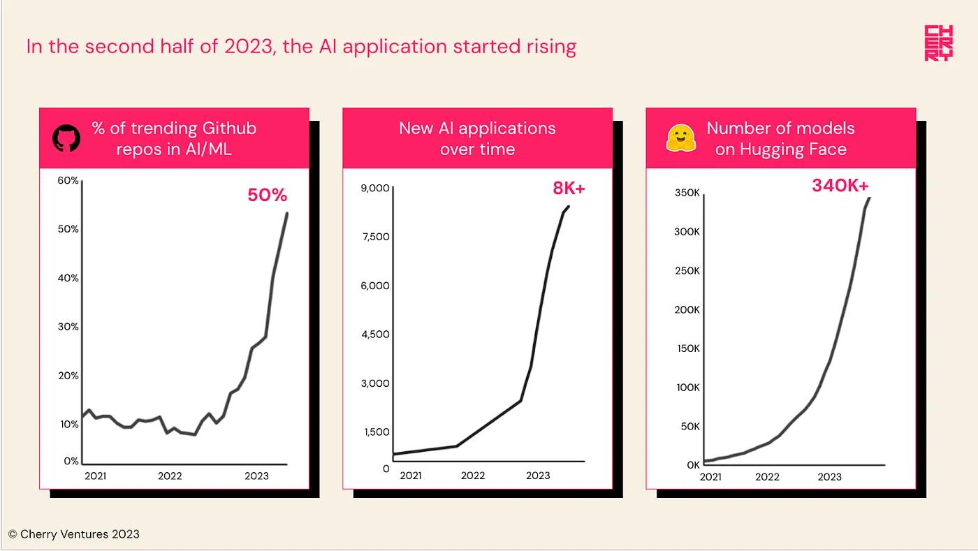 It is also becoming clear that we have entered the next wave of AI. Over 300K+ models have been shared on HuggingFace, 50%+ of trending GitHub repositories have been about AI, and well over 8,000 AI apps have already been created. At the same time, applications are becoming more sophisticated and we are starting to see a real impact on the venture ecosystem, tech stacks, and the broader economy.